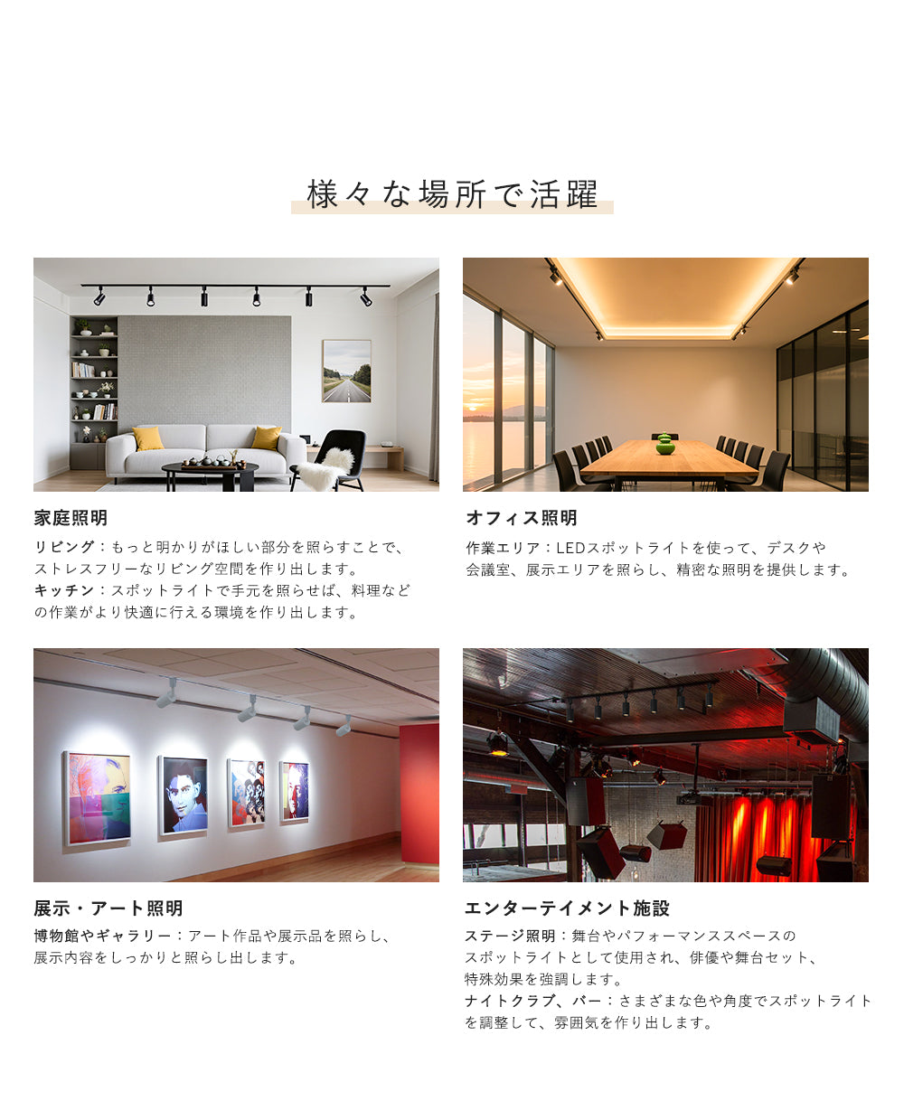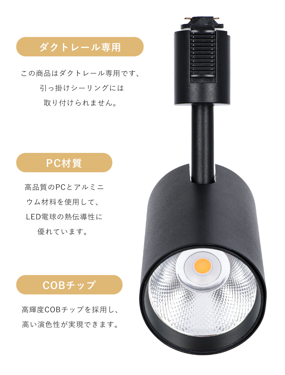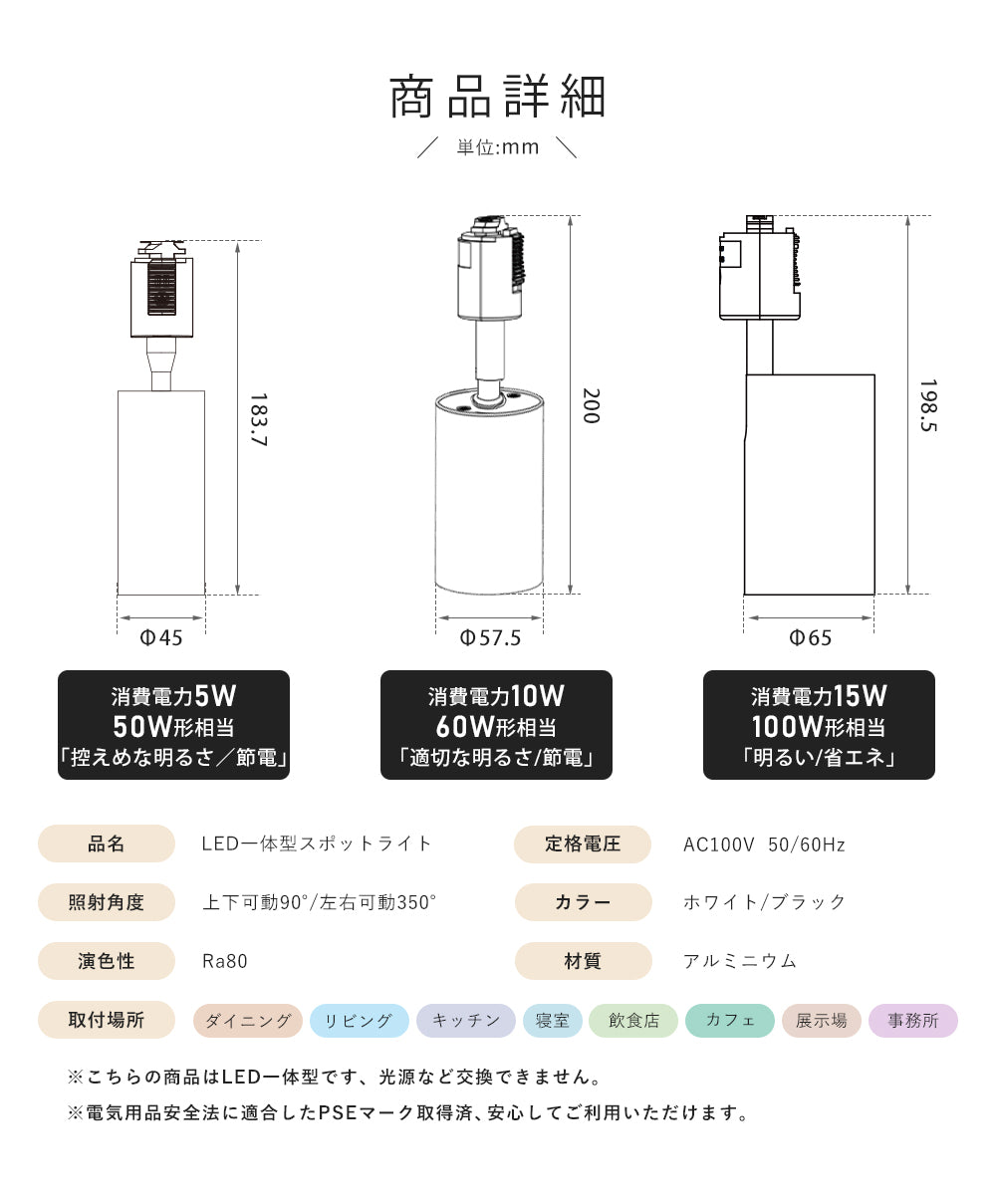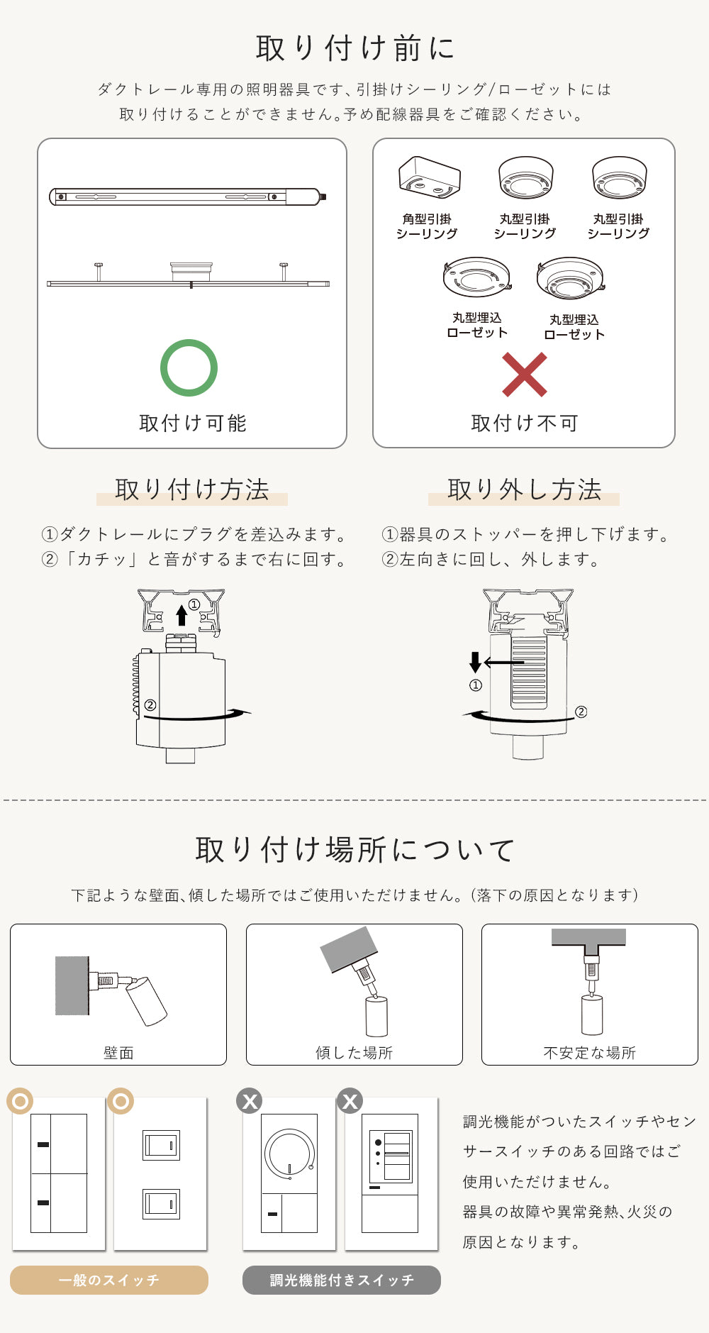 ※ダクトレール別売り。 ※器具LED内蔵一体型のため、電源を取り替えません。 ※取り付け・取り外しの際には必ず電源を切ってください。 ※配線ダクトレール専用照明器具です。引っ掛けシーリングには取付できません。 ※照明器具には寿命があります。外観に異常がなくても内部は劣化してしまいました。点検せずに長時間使い続けるとまれに火災、感電、落下などに至る場合があります。 ※浴室など湿気の多い場所や屋外で使用しない。火災、感電の原因となります。(この器具は防湿、防雨型ではありません。) ※点灯中や消灯直後のランプやその周辺にさわらないやけどの原因になることがあります。(お手入れやランプ交換は電源を切り、ランプやその周辺が冷めてから行ってください。) ※他のリモコン付き照明器具に対応しておりません。 ※調光機能が付いている照明器具に対応しておりません。 |