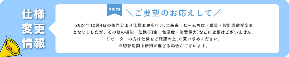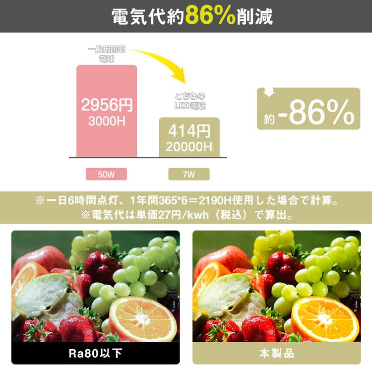 ●【物をキレイに見せる高演色】:演色評価数は80以上、「太陽光で見た色に近い色」を再現できます。光は眩しかなくくてちらつきがない、長い時間使っても目が疲れません。 ●【長寿命】設計寿命は約20000時間で、一般白熱電球の約40倍!取り替えが面倒な高所への設置もオススメ!※実際の使用寿命は使用環境により異なります。 ●【熱くなりにくい・紫外線フリー】:水銀も含まず、人と環境にもやさしいです。それに、紫外線と赤外線はほとんど出ないので、虫が集まりにくく、灯具清掃の手間を省けます。さらに、紫外線フリーは、芸術品などの展示物の色褪せや劣化を防止することができるので、美術館や博物館などでも活躍しています。 ●【安全安心】万が一の時にも割れにくい樹脂カバーを採用します。PSEにて認証済みです。安心してお使いください。 |